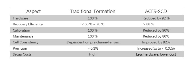 The ACFS-SCD combines advanced Series Charge-Discharge technology, Multiple Stage Constant Current (MSCC) charging, and Dynamic Bypass (DYBP), to achieve hardware and operational cost savings, high discharge recovery efficiency, and unparalleled cell formation consistency.